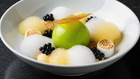 A sophisticated dessert presentation features a central green sphere surrounded by creative culinary elements. The composition includes airy white foam, yellow accents, and black caviar-like components. The lighting emphasizes the textures, and the overall style suggests a high-end dining context, suitable for editorial and commercial applications.