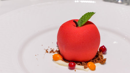 White chocolate custard tart with pomegranate jelly, home bakery on the dish over the fern leaaves in the garden