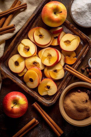 Generative AI : Apple tart with vanilla pod on vintage tray Traditional holiday dessert Wooden rustic background