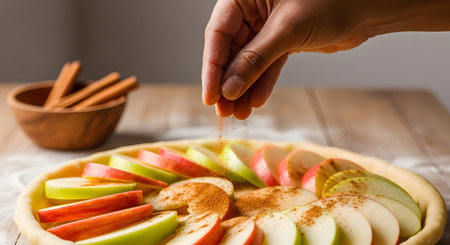 A close-up shot of a hand sprinkling cinnamon spice onto a pie crust beautifully arranged with sliced red and green apples. In the background, a wooden bowl with cinnamon sticks is visible on the rustic wooden table. This image captures the process of baking an apple pie.