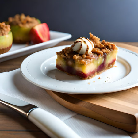 German apple cake slice on rustic plate, autumn backdrop, room for text