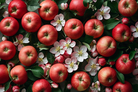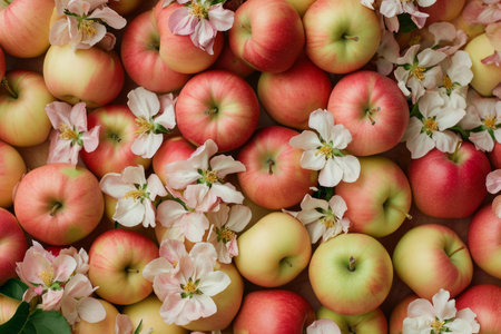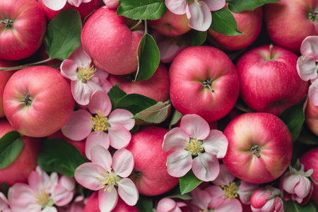 A bright red apple rests among delicate pink flowers with soft petals showing the beauty of spring.
