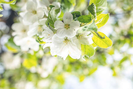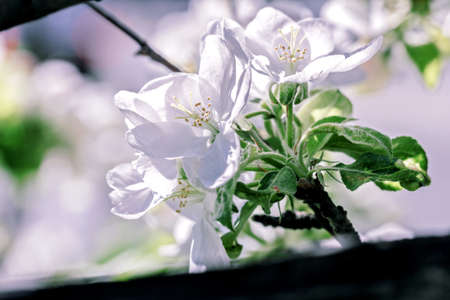 Delicate white Apple blossom in the spring garden. The focus is in the foreground, the background is out of focus. Spring flowers, spring background, flower background. Side view, space for text