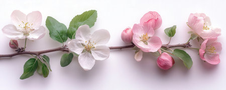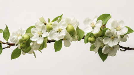 Blooming apple tree branch with delicate white flowers and green leaves isolated on a white background, celebrating the beauty of spring