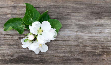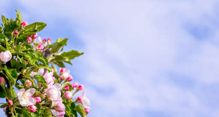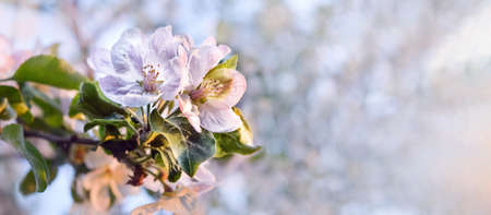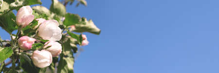 Banner with branch of flowering white apple tree. Beautiful bloom garden with copy space.