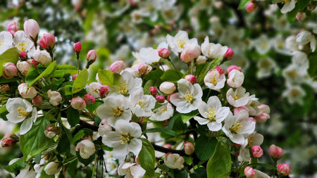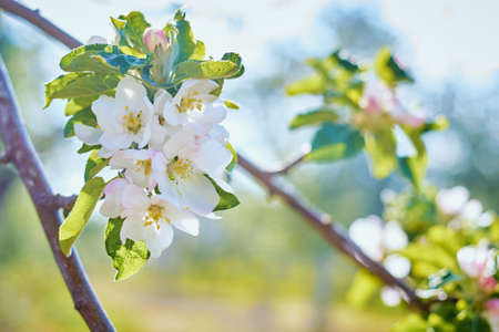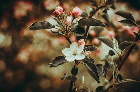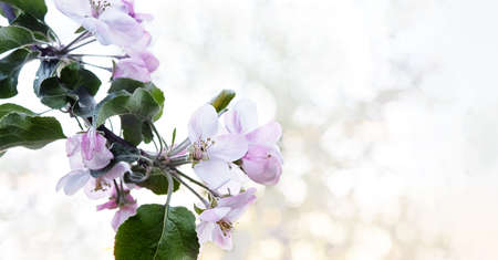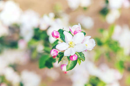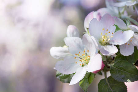 Florescence of apple tree in the garden close-up spring scene on bright bokeh background