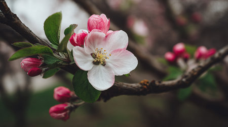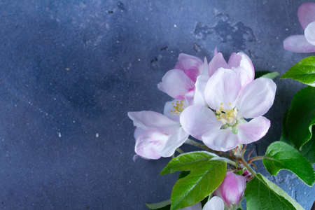 Spring flowers, apple tree branches with pink and white flowers and green leaves on gray background, selective focus. Spring blossom