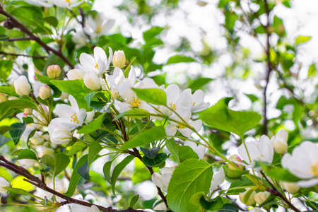 Tree branches with flowers of Malus sylvestris, the European crab apple, in the garden.