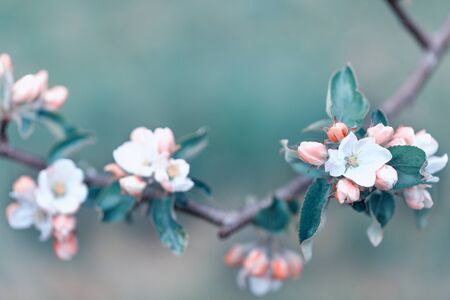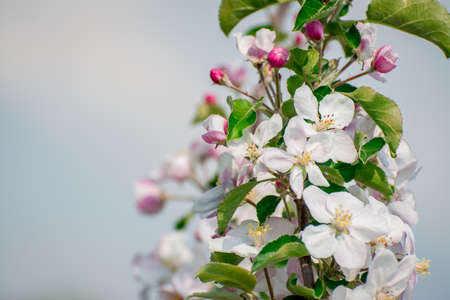 background with spring apple blossom. Blossoming branch in springtime Blooming apple tree in spring time.fresh Apple tree twig with flowers and leaves on garden