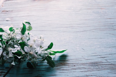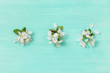 Top view on beautiful apple tree flowers on turquoise wooden background. Spring flowers. Flat lay. Spring concept.