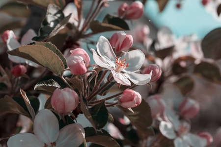 Beautiful flowers of an apple tree on a tree in sunlight. Spring. Blurred background. Selective focus. Warm light.