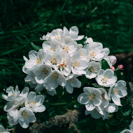 Square photo. Apple blossoms bloom in spring. Beautiful Ukrainian nature.