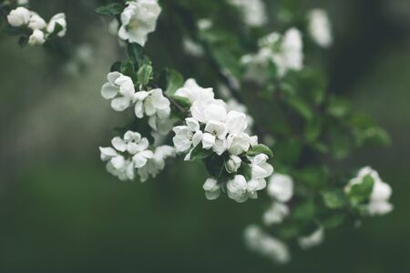 Nature floral background. Blooming Apple tree. White Apple blossoms on a branch close-up. Live wall of flowers in a spring garden.