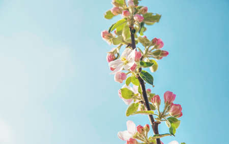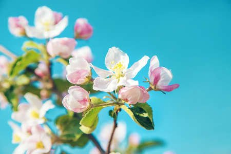 Beautiful floral spring abstract background of nature. Branches of blossoming apple tree light blue sky background. Copy space. Nature background