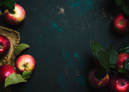 Fresh organic red apples on black background. Flat lay. Frame. Top view. Copy space. Autumn harvest