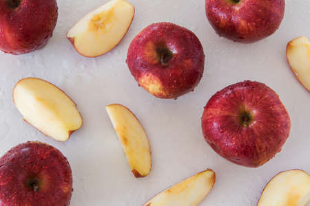 Top view of fresh red apples with water droplets on a white marble surface, highlighting their vibrant color and freshness.