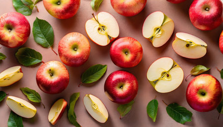Flat lay of whole and sliced apples forming a natural pattern on white