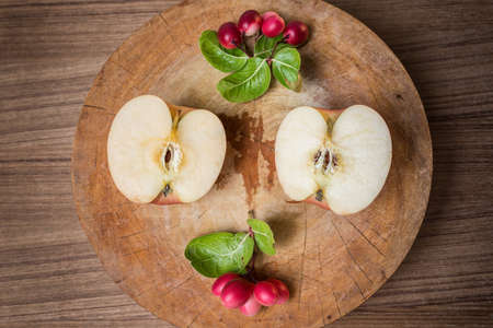 healthy plant-based food ingredients concept, apple halves on wooden table