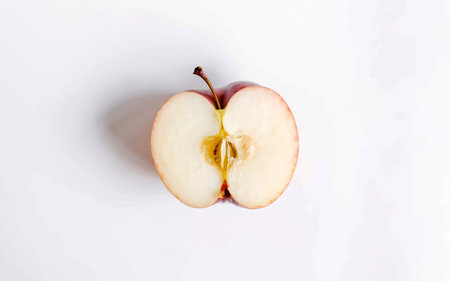 Top view of organic red apple isolated on white background. Fresh fruit from domestic tree. Copyspace for text.