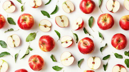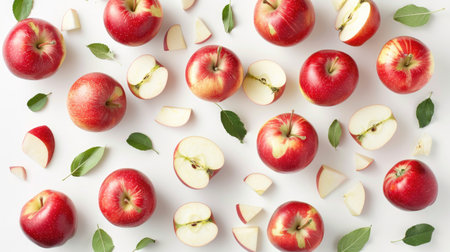A composition of whole and sliced apples spread across a white background, showcasing their freshness and inviting texture