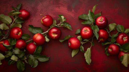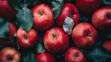 Close-up of fresh red apples with green leaves, highlighting their natural texture and vibrant color. Ideal for food and healthy eating themes.