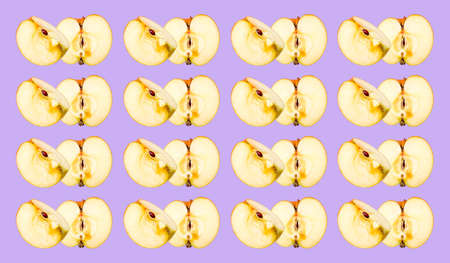 Fruit pattern on blue background. Apple halves geometrical layout. Flat lay, top view. Food background.. Pop art design, creative summer concept.