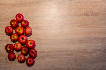 Raw red apples on a white wooden background, top view. Flat lay, from above, overhead. Closeup.