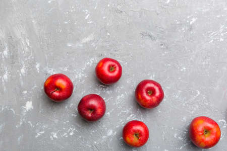 Apples on white stone background, top view, copy space. Garden organic red and yellow apples.