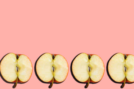 Sliced red apples on pastel pink background, minimal concept, copy space, banner