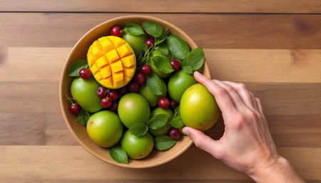 Top view of a woman's hand holding a bowl of fresh fruits on a wooden table