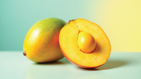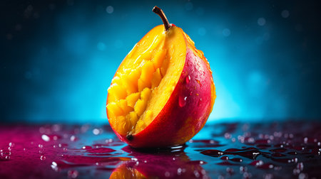 Photo of Mango fruit half against a colorful abstract background