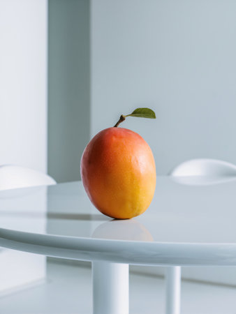 A vibrant mango with a green leaf sits elegantly on a white table in a minimalistic setting.