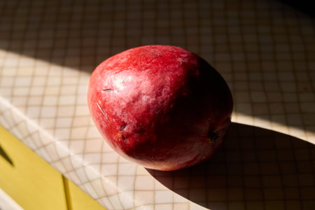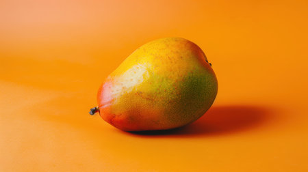 A plump, ripe mango rests on a vibrant orange surface, bathed in the warm glow of the afternoon sun. The fruit's smooth skin shimmers with a mix of yellow, green, and orange hues, hinting at the sweet and juicy treasure within.