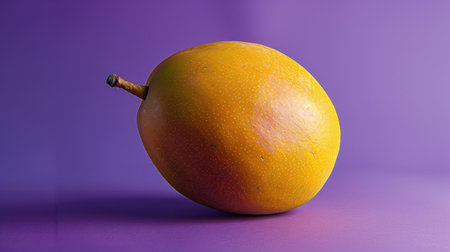 A single ripe mango, with a dark brown stem, rests on a smooth, bright purple surface. The mango is positioned slightly off-center, with the majority of its form visible to the viewer. The natural light illuminates the fruit, highlighting its golden-yellow hue.