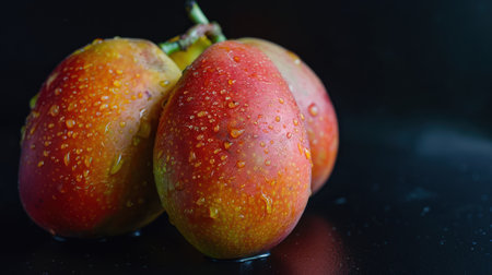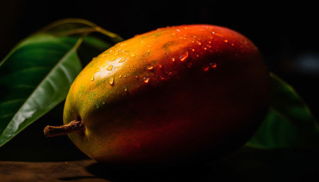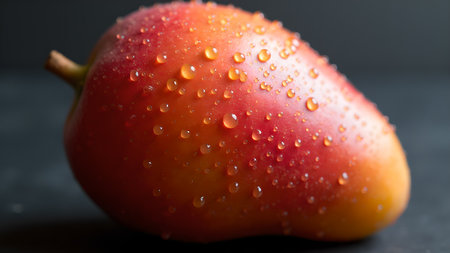 A close-up studio shot showcasing a fresh, ripe mango adorned with water droplets, set against a dark backdrop. The mango's vibrant colors and juicy texture are highlighted, emphasizing its tropical sweetness and healthy appeal.