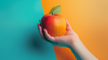 A hand holding a vibrant apple against a colorful background. The bright, contrasting colors create a striking and modern image.