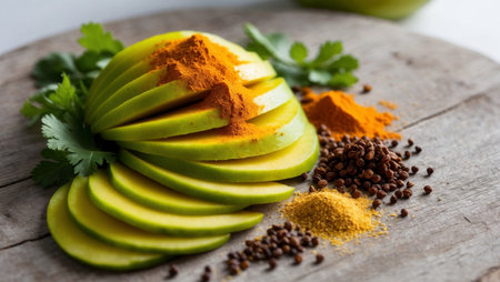 AI Generated. Zesty mango pickle featuring sliced green mangoes and fragrant spices on a wooden surface
