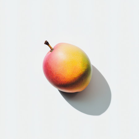 A single, ripe mango rests on a soft pastel background, featuring gentle shadows and sunlight highlights, symbolizing freshness and health.