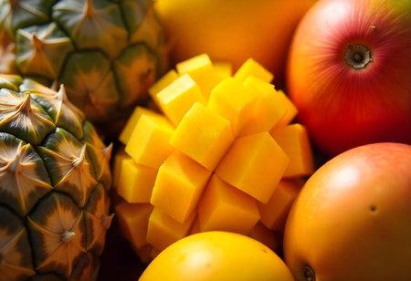 Ripe mango cut into cubes and whole pineapple, displaying vibrant yellow and green colors, alongside other tropical fruits