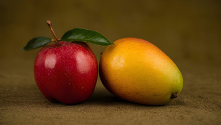 A vibrant red apple and a ripe yellow mango placed sidebyside on a textured brown surface, showcasing a simple yet appealing still life of healthy fruits