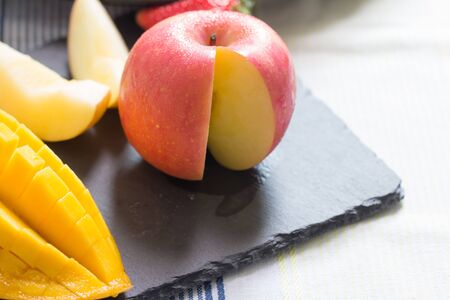 Apple and mango on a black stone plate