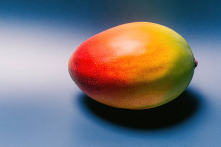 Fresh ripe mango with vibrant colors on a smooth blue surface, symbolizing healthy eating and tropical fruits Ideal for food photography and nutrition concepts