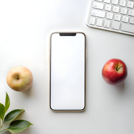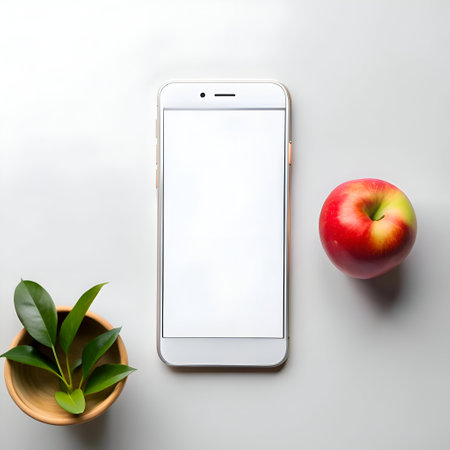 Clean and minimalist mockup of a white iPhone with a blank screen. an apple. and a small potted plant on a white background. Perfect for showcasing your app. website. or design.