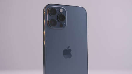 Beijing, China - 11.23.2020: Close up of a new iPhone 12 Pro Max in Pacific blue color. Action. Presentation of a new device with three cameras isolated on white background.