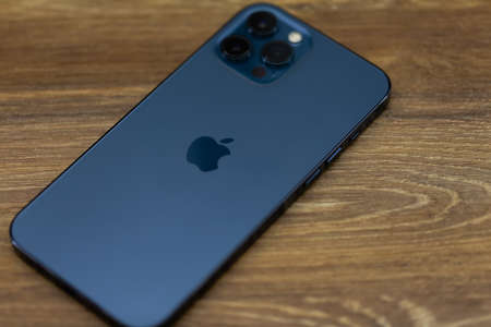 Chernivtsi, Ukraine - march. 2021: Apple iphone 12 Pro Max blue smartphone on a white wooden table in the office