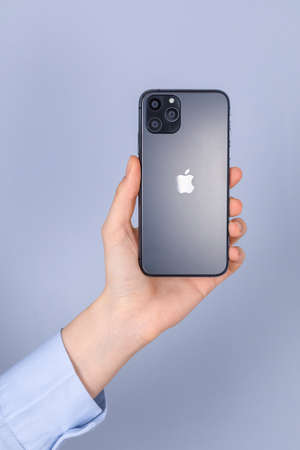 Galati, Romania, March, 18, 2020: New iPhone 11 Pro. iPhone 11 Pro is a smartphone developed by Apple Inc. Hand holding space gray smartphone back view closeup.