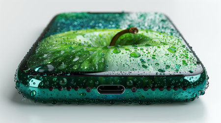 A smartphone screen acts as a portal, offering a crystal-clear, magnified view of a single water droplet creating perfect ripples.