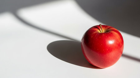 A single, vibrant red apple sits on a white surface, casting a long, dramatic shadow. Natural light creates stark contrasts.