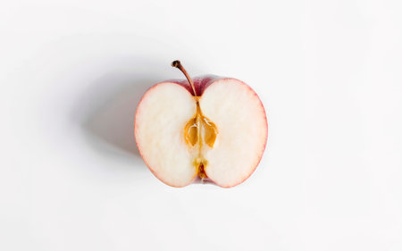 Cut half of an apple on a white background. Top view, flat lay. Banner.