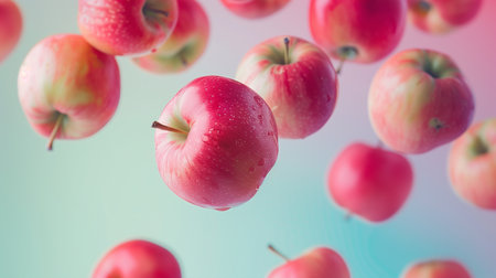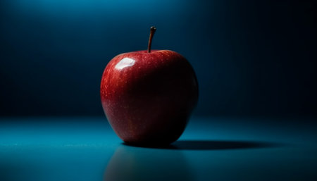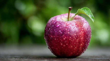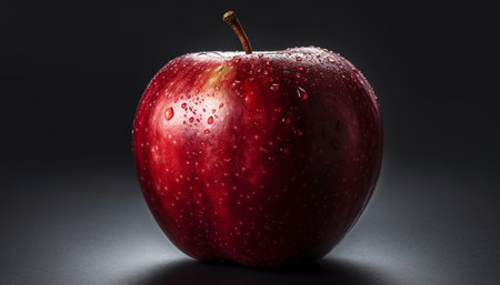 A vibrant red apple with water droplets glistening on its surface, showcasing fresh and healthy fruit. Ideal for promoting nutrition and organic food.